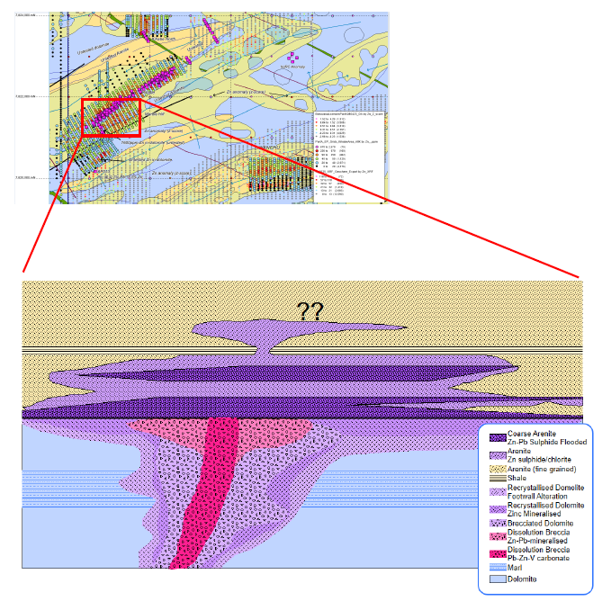 Historical work has outlined extensive low-grade, large-tonnage sulphide and oxide zinc mineralisation within sandstones typical of a Mississippi Valley Type (MVT) system. More recently, a newly recognised carbonate replacement system within dolomite has revealed exceptionally high-grade vein and breccia mineralisation exceeding 25% Zn and 19% Pb.
