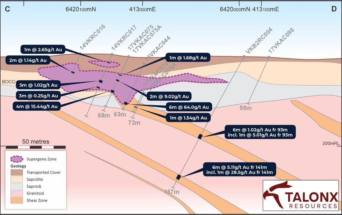 • 6m @ 64.0g/t Au from 50m