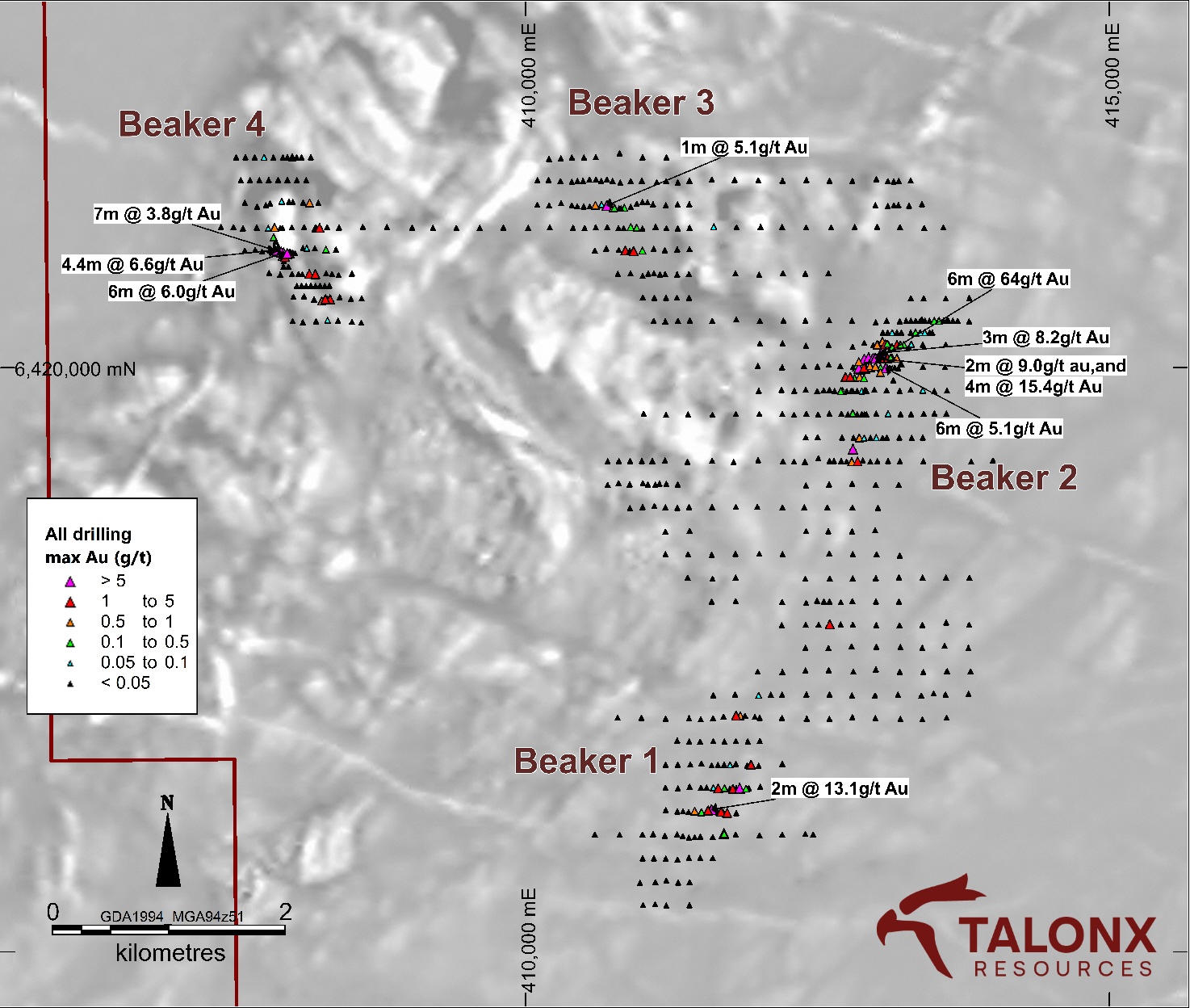 The Company will investigate the potential for a shallow high grade oxide gold resource at Beaker 2 in addition to deeper bedrock testing at Beaker Prospects 1, 2 and 4.